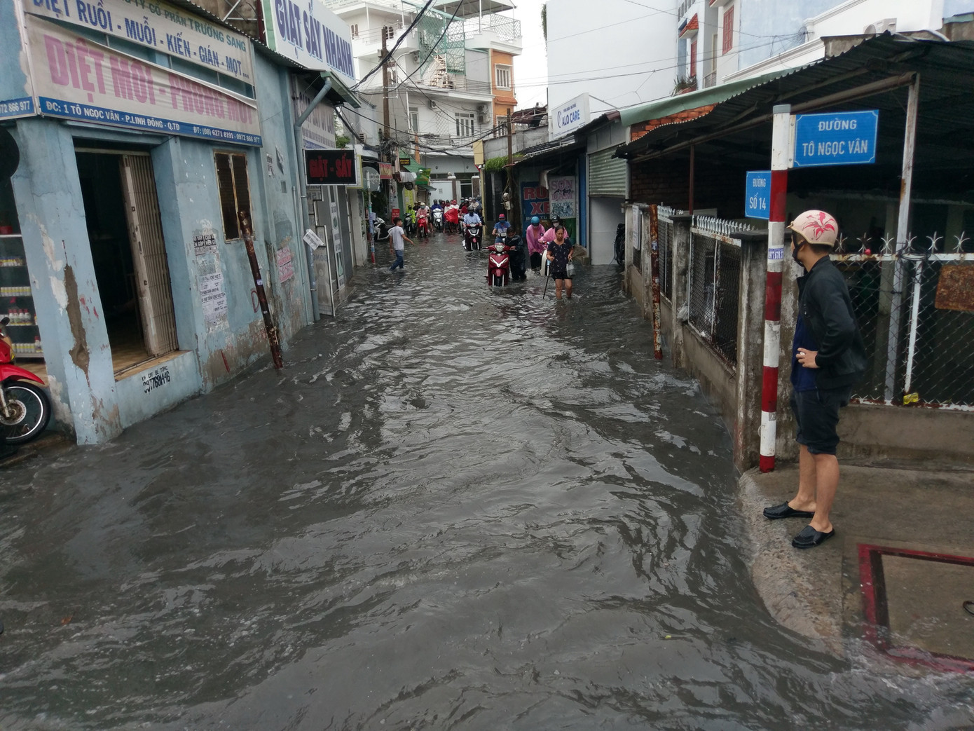 Các tuyến đường như Tô Ngọc Vân, Võ Văn Ngân (quận Thủ Đức), Lê Văn Việt, Lã Xuân Oai (quận 9)..., nước mưa từ các khu dân cư đổ ra chảy như thác.