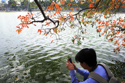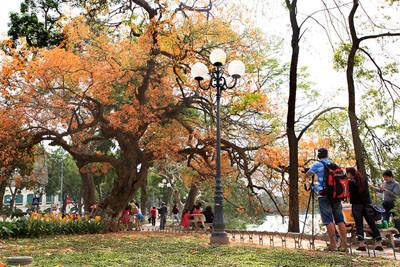 Cứ mỗi mùa thay lá hay trổ hoa, cây lộc vừng cổ thụ bên bờ Hồ Gươm lại thu hút khách du lịch, và các tay máy đến thỏa sức bấm máy.