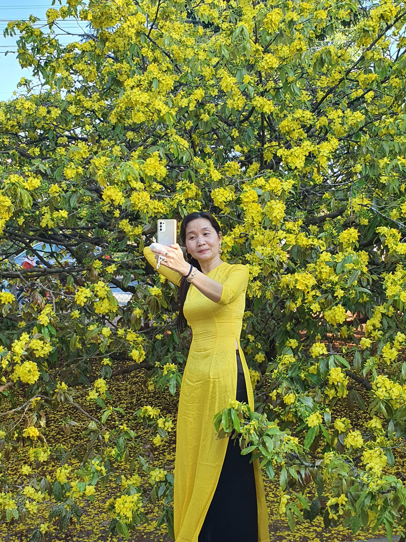 Cùng nhóm bạn chụp bộ ảnh đầu xuân với cây mai vàng, chị Nguyễn Kim Phương ở TP Biên Hòa cho hay, năm nào chị cũng dành ngày mùng 2 Tết về chúc Tết bố mẹ và không quên chụp ảnh với cây mai.