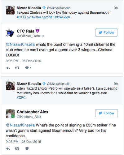 “Eden Hazard và/hoặc Pedro sẽ chơi như một số 9 ảo. Tôi đoán rằng Batshuayi cũng biết trước cậu ấy sẽ không có một suất trong đội hình xuất phát”, nick Nizaar Kinsella nhận định trước khi trận đấu diễn ra.