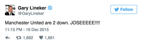 Gary Lineker, cựu sao tiền đạo tuyển Anh, hiện là bình luận viên truyền hình, cũng bày tỏ quan điểm trên Twitter ngay sau khi Man Utd bị Norwich dẫn trước hai bàn: “2-0 rồi, Man Utd gọi tên Jose Mourinho”.