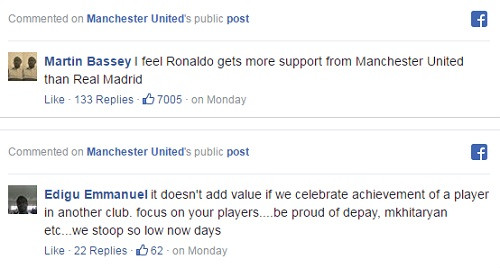 "Tôi có cảm giác Ronaldo được ủng hộ ở Man Utd nhiều hơn ở Real Madrid", tài khoản Martin Bassey bình luận phía dưới bài đăng chúc mừng Ronaldo của Man Utd. Ý kiến này nhận được 7000 lượt thích.