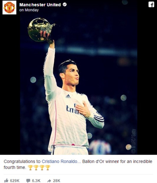 Trên trang Facebook chính thức, Man Utd gửi lời chúc mừng Ronaldo về thành tích này. Họ đăng một tấm ảnh chụp cầu thủ từng chơi tại Old Trafford với chú thích: "Chúc mừng Cristiano Ronaldo... Đoạt Quả Bóng Vàng lần thứ tư một cách xuất sắc".