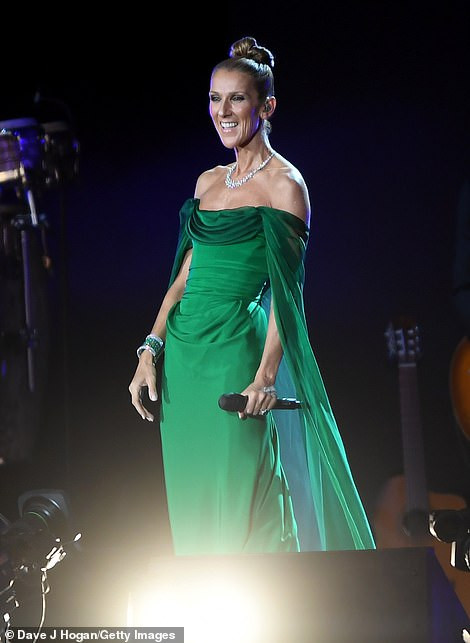 Celine Dion đội tóc giả, diện đầm đuôi dài cắt cúp ấn tượng, lộ vóc dáng gầy gò mảnh khảnh với vòng eo nhỏ xíu.