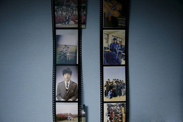 Những bức ảnh của Jung Hwi-beom trên tường. Ước mơ của cậu là trở thành nhà thiết kế xe hơi.