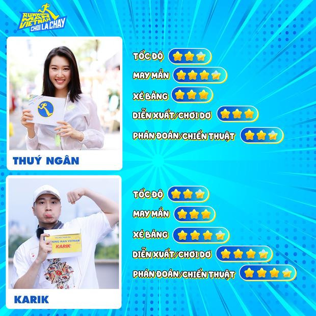 Karik không được đánh giá cao về tốc độ do bị thương ở chân. Có lẽ do những phát ngôn mặn mà của mình mà Karik lại được đánh giá cao về các tiêu chí còn lại như độ may mắn, khả năng xé bảng tên, độ "chơi dơ" hay lên chiến thuật.