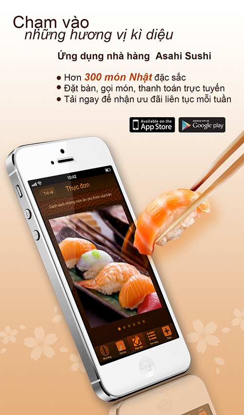 Chương trình mang đến cho Quý khách sự trải nghiệm mới mẻ về những tính năng hoàn hảo kết hợp giữa ẩm thực và công nghệ. Giờ đây chỉ cần một chiếc Smartphone, tablet có cài ứng dụng của nhà hàng Asahi Sushi, Quý khách có thể đặt bàn, lựa chọn thực đơn với hơn 300 món Nhật đặc sắc, đặt món Online, đặt mua Voucher, thanh toán trực tuyến tiện lợi, nhanh chóng, đẳng cấp ở bất kỳ nơi đâu, bất kỳ khi nào.