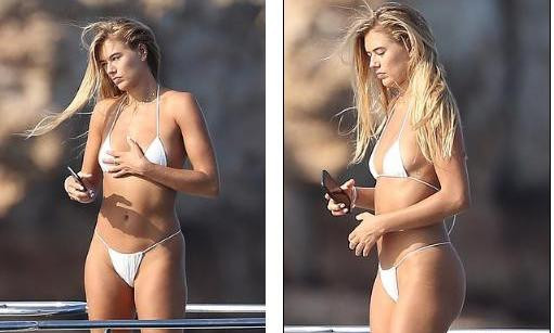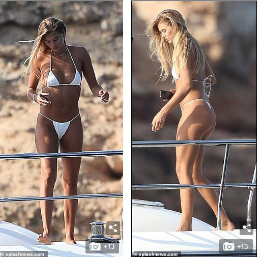 Arabella Chi 28 tuổi phô dáng nảy nở gợi cảm với bikini trắng bé xíu trong khi cô bạn Elma Pazar 26 tuổi sexy với áo tắm 2 mảnh màu đen tôn làn da nâu khoẻ khoắn, nóng bỏng.
