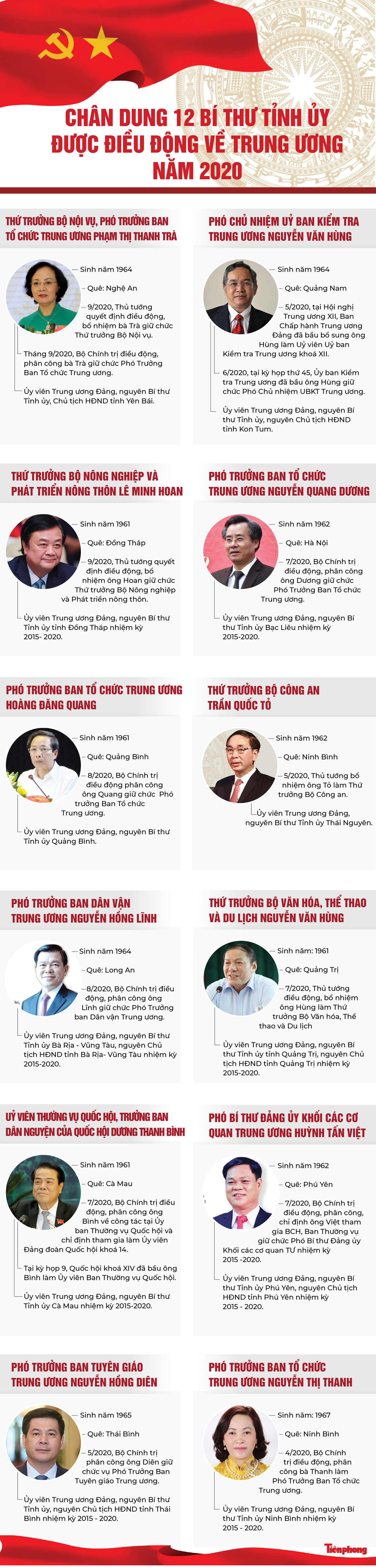 TPO - Từ đầu năm đến nay, có 12 Bí thư Tỉnh ủy được điều động, phân công, bổ nhiệm về các ban, ngành Trung ương.