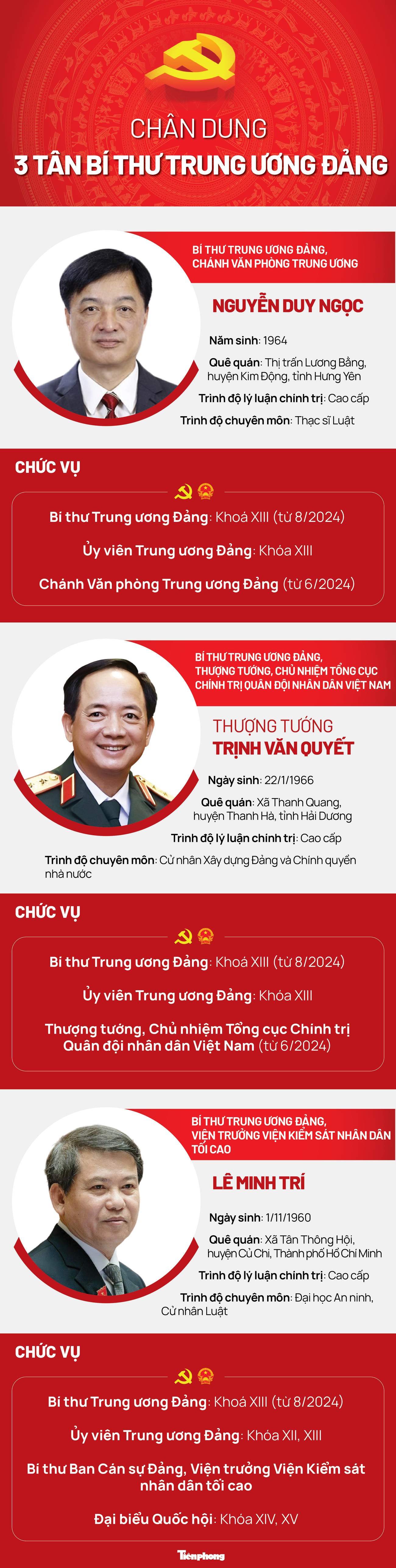 TPO - Ngày 16/8/2024, Ban Chấp hành Trung ương đã bầu các ông: Nguyễn Duy Ngọc - Chánh Văn phòng Trung ương Đảng; Trịnh Văn Quyết - Chủ nhiệm Tổng cục Chính trị Quân đội Nhân dân Việt Nam; Lê Minh Trí - Viện trưởng Viện Kiểm sát Nhân dân Tối cao vào Ban Bí thư Trung ương Đảng khoá XIII.
