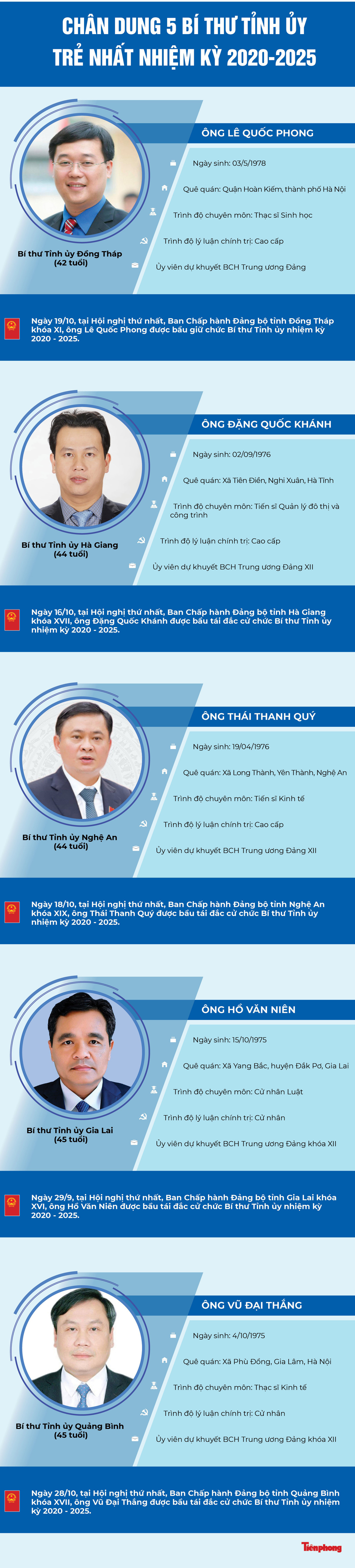 TPO - Đến nay 63 tỉnh, thành ủy đã hoàn thành việc tổ chức Đại hội nhiệm kỳ 2020 - 2025. Kết quả bầu cử Bí thư tỉnh, thành ghi nhận 5 Bí thư Tỉnh uỷ trẻ nhất hiện nay là ông Lê Quốc Phong (Đồng Tháp), ông Đặng Quốc Khánh (Hà Giang), ông Thái Thanh Quý (Nghệ An), ông Hồ Văn Niên (Gia Lai) và ông Vũ Đại Thắng (Quảng Bình).