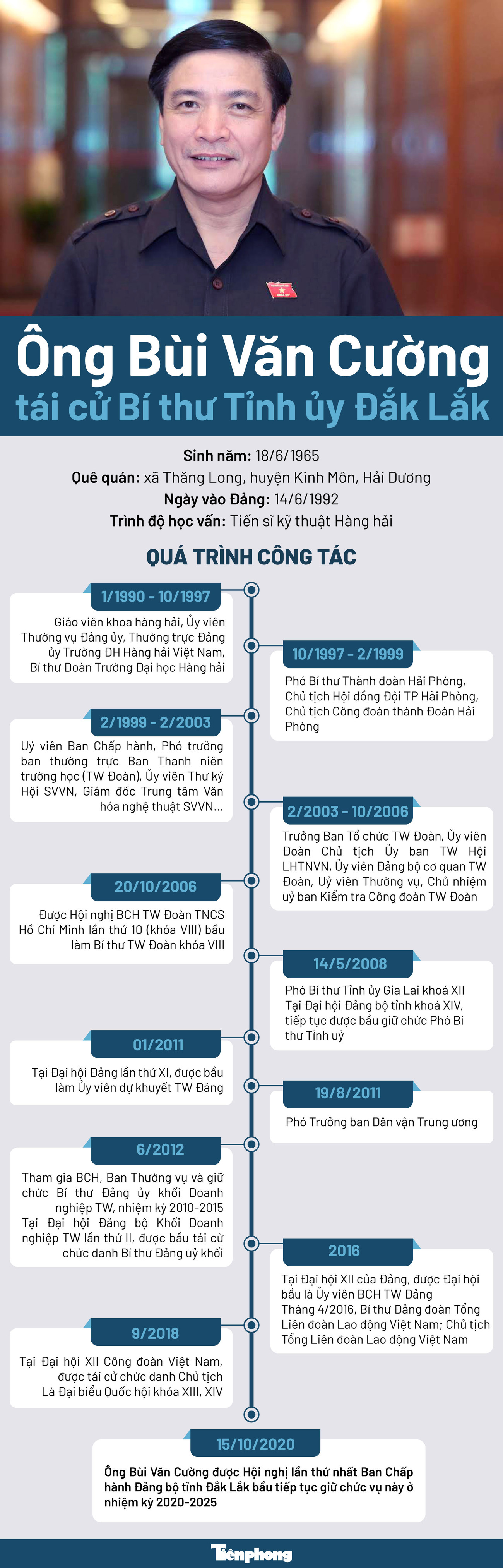 TPO - Ngày 15/10, ông Bùi Văn Cường, Ủy viên Trung ương Đảng, Bí thư Tỉnh ủy Đắk Lắk, được Hội nghị lần thứ nhất Ban Chấp hành Đảng bộ tỉnh Đắk Lắk bầu tiếp tục giữ chức vụ này ở nhiệm kỳ 2020-2025.