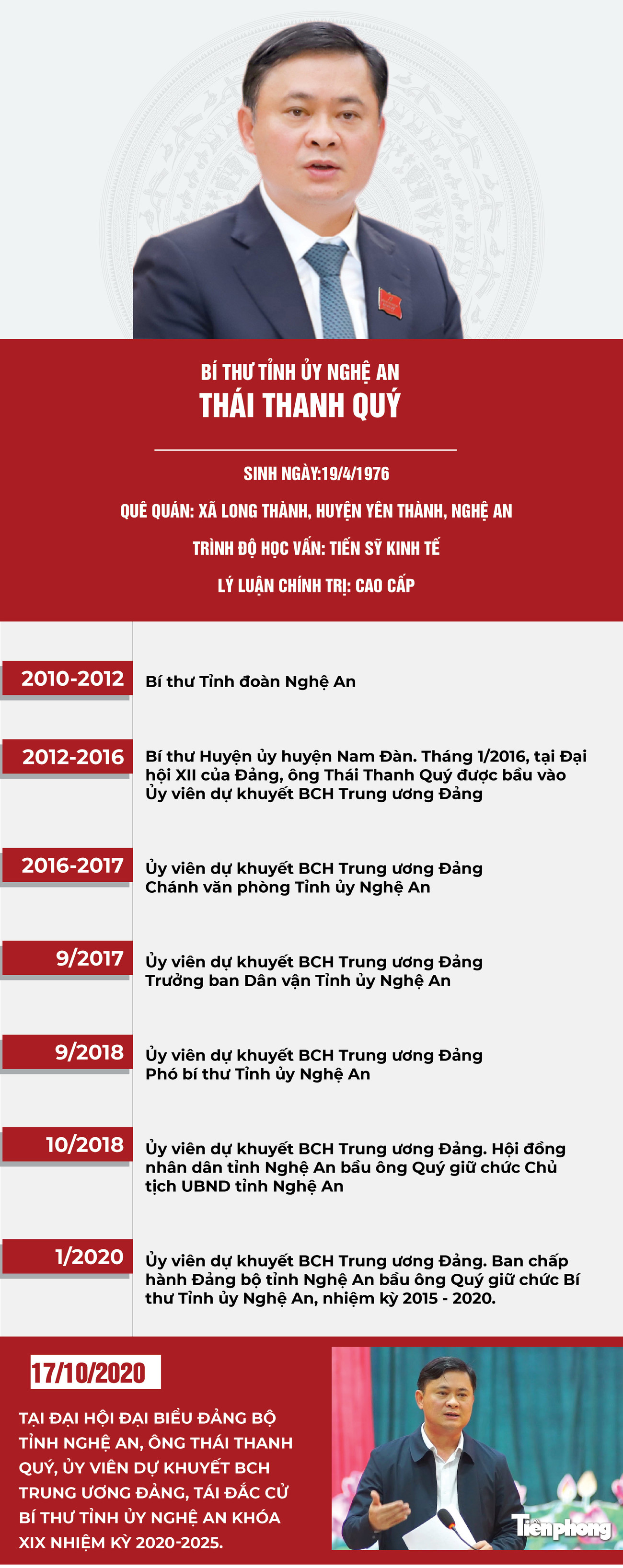 TPO - Ông Thái Thanh Quý - Ủy viên dự khuyết Trung ương Đảng, Bí thư Tỉnh ủy Nghệ An khóa XVIII, tái đắc cử Bí thư Tỉnh ủy khóa XIX, nhiệm kỳ 2020 - 2025.