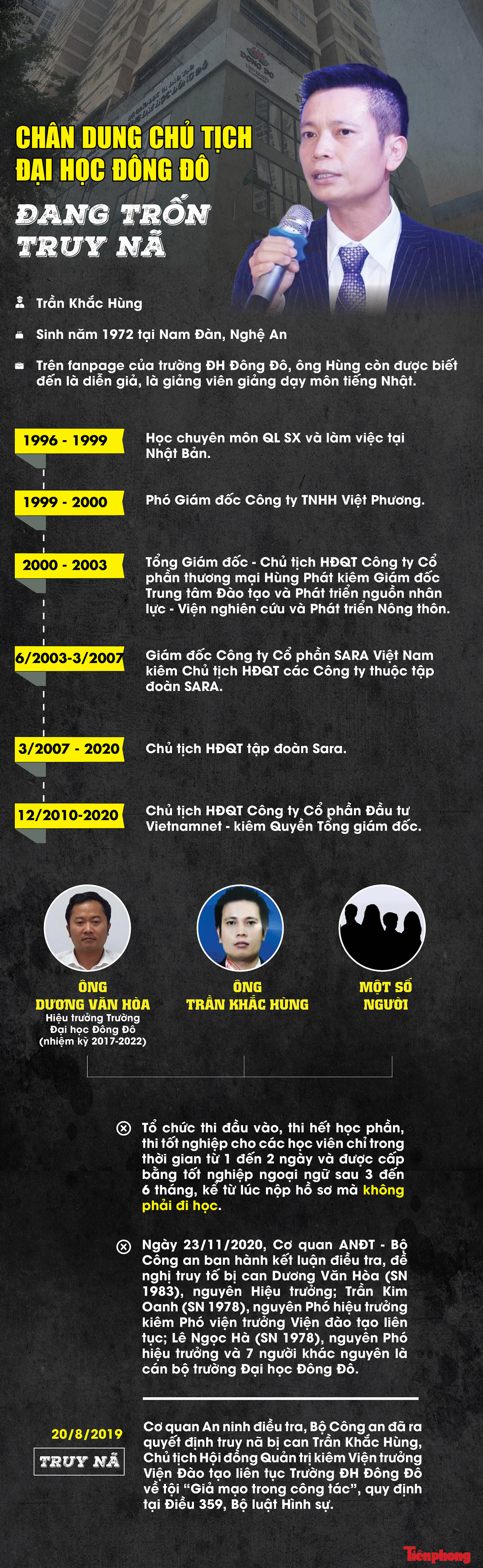 TPO - Cơ quan ANĐT Bộ Công an vừa đề nghị truy tố cựu Hiệu trưởng Đại học Đông Đô - Dương Văn Hòa (SN 1983) cùng một loạt cán bộ trường này trong vụ cấp hàng trăm văn bằng giả. Chủ mưu vụ án được xác định là bị can Trần Khắc Hùng (SN 1972, Chủ tịch HĐQT Đại học Đông Đô) vẫn đang bỏ trốn.