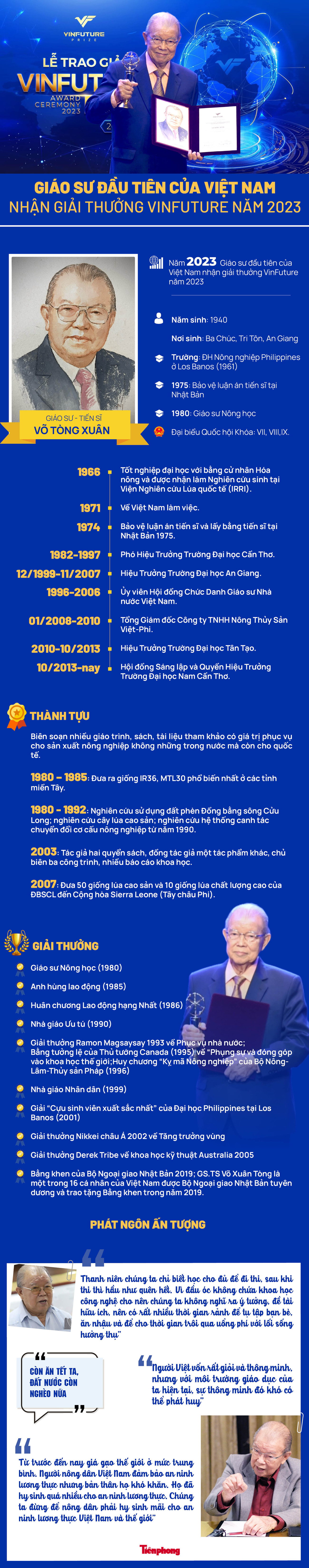 TPO - GS Võ Tòng Xuân cùng người đồng nghiệp – GS Gurdev Singh Khush (người Mỹ gốc Ấn) là hai nhà khoa học được vinh danh ở hạng mục Giải Đặc biệt VinFuture 2023 dành cho Nhà khoa học đến từ các nước đang phát triển.