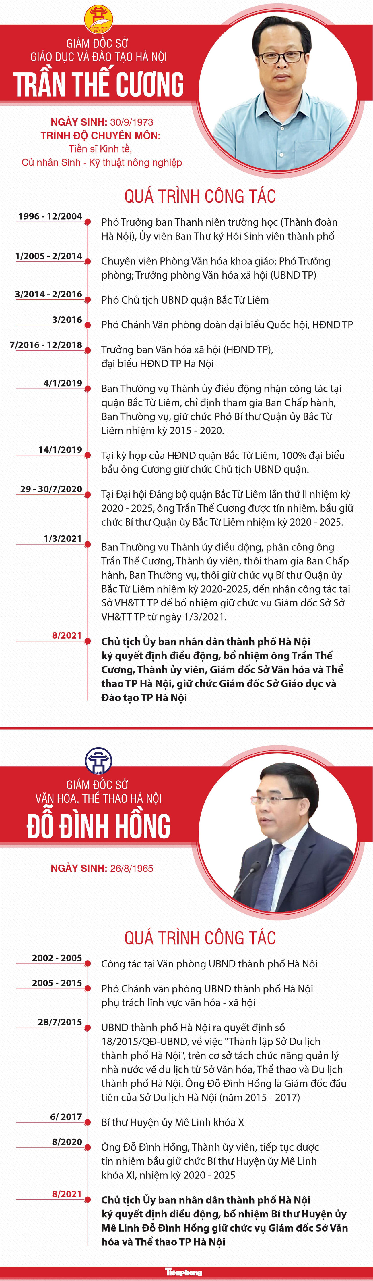 TPO - Chủ tịch UBND TP Hà Nội vừa ký quyết định bổ nhiệm ông Trần Thế Cương giữ chức vụ Giám đốc Sở Giáo dục và Đào tạo, ông Đỗ Đình Hồng giữ chức vụ Giám đốc Sở Văn hóa và Thể thao TP Hà Nội.