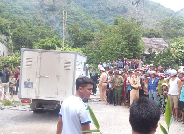 Người dân tụ tập bên ngoài nhà Công an khu vực tuyến Quốc lộ 70 (Công an huyện Lục Yên), được cho là nơi tạm giữ nghi can. Ảnh: Võ Hải.