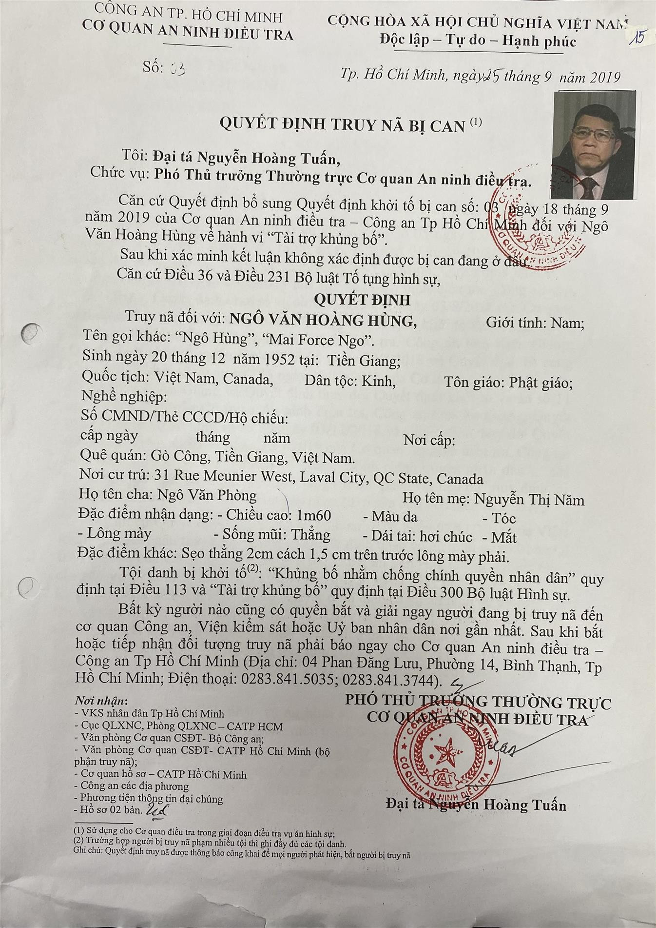 Cáo trạng cũng nêu, Ngô Văn Hoàng Hùng là kẻ cầm đầu, tài trợ hoạt động khủng bố. Cơ quan pháp luật đã quyết định khởi tố, truy nã quốc tế đối với Ngô Văn Hoàng Hùng. Đây là đối tượng chống đối chính quyền, từng lãnh án chung thân về tội “Âm mưu lật đổ chính quyền”. Sau khi vượt biên, Hùng tiếp tục câu kết, móc nối với các đối tượng phản động khác.