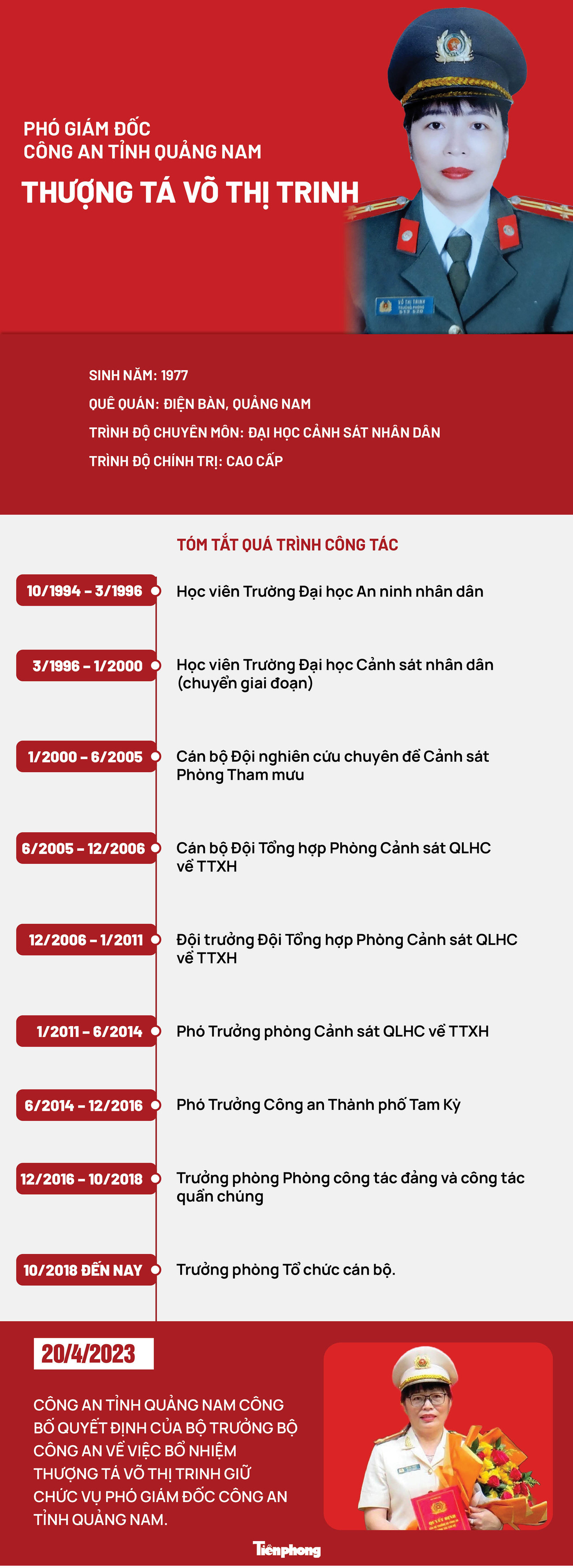 TPO - Ngày 20/4, Công an tỉnh Quảng Nam công bố quyết định của Bộ trưởng Bộ Công an về việc bổ nhiệm Thượng tá Võ Thị Trinh - Trưởng phòng Tổ chức Cán bộ Công an tỉnh Quảng Nam, giữ chức vụ Phó Giám đốc Công an tỉnh Quảng Nam. Đây là nữ Phó Giám đốc đầu tiên của Công an tỉnh Quảng Nam.