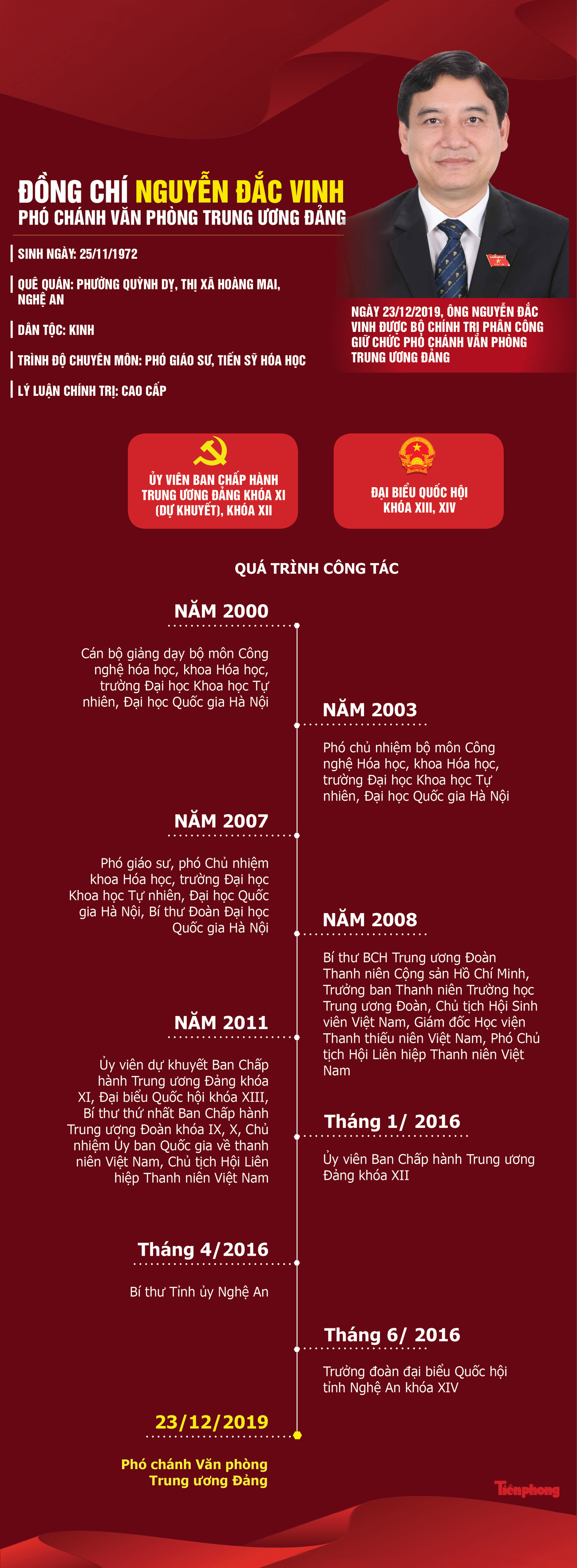 TPO - Sáng 23/12, tại Hà Nội, Văn phòng Trung ương Đảng tổ chức Lễ công bố quyết định của Bộ Chính trị về công tác cán bộ. Theo đó, ông Nguyễn Đắc Vinh được điều động, phân công giữ chức Phó Chánh Văn phòng Trung ương Đảng.