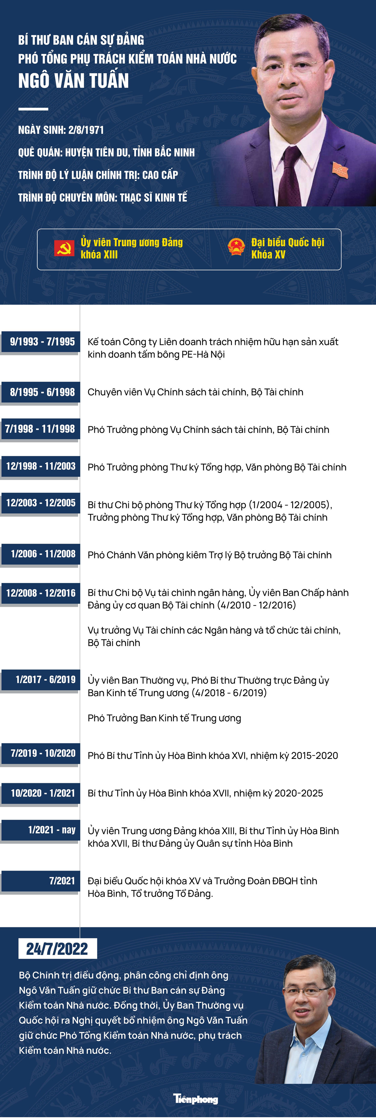 TPO - Bộ Chính trị điều động, phân công ông Ngô Văn Tuấn - Ủy viên Trung ương Đảng khóa XIII, thôi tham gia Ban chấp hành, Ban Thường vụ và thôi giữ chức Bí thư Tỉnh ủy Hòa Bình, nhiệm kỳ 2020-2025, để chỉ định giữ chức Bí thư Ban cán sự Đảng Kiểm toán Nhà nước. Đồng thời, Ủy Ban Thường vụ Quốc hội ra Nghị quyết bổ nhiệm ông Ngô Văn Tuấn giữ chức Phó Tổng Kiểm toán Nhà nước, phụ trách Kiểm toán Nhà nước. Thời hạn bổ nhiệm 5 năm kể từ ngày 24/7/2022.