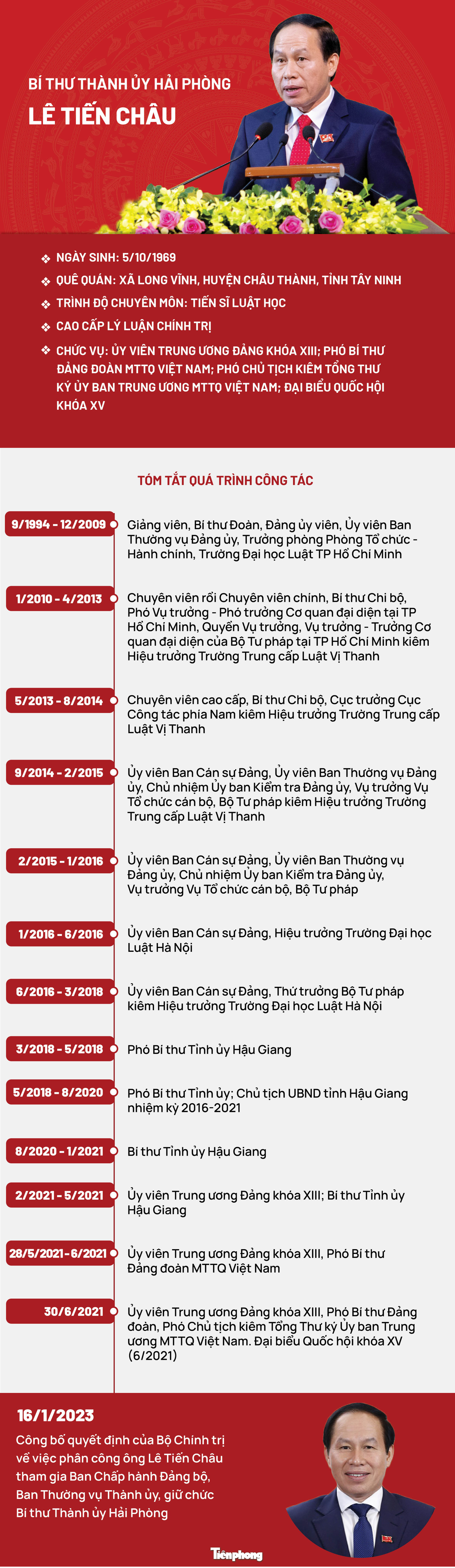 TPO - Bộ Chính trị phân công ông Lê Tiến Châu-Phó Chủ tịch, Tổng thư ký Ủy ban Trung ương Mặt trận Tổ quốc Việt Nam, tham gia Ban Chấp hành Đảng bộ, Ban Thường vụ Thành ủy, giữ chức Bí thư Thành ủy Hải Phòng.