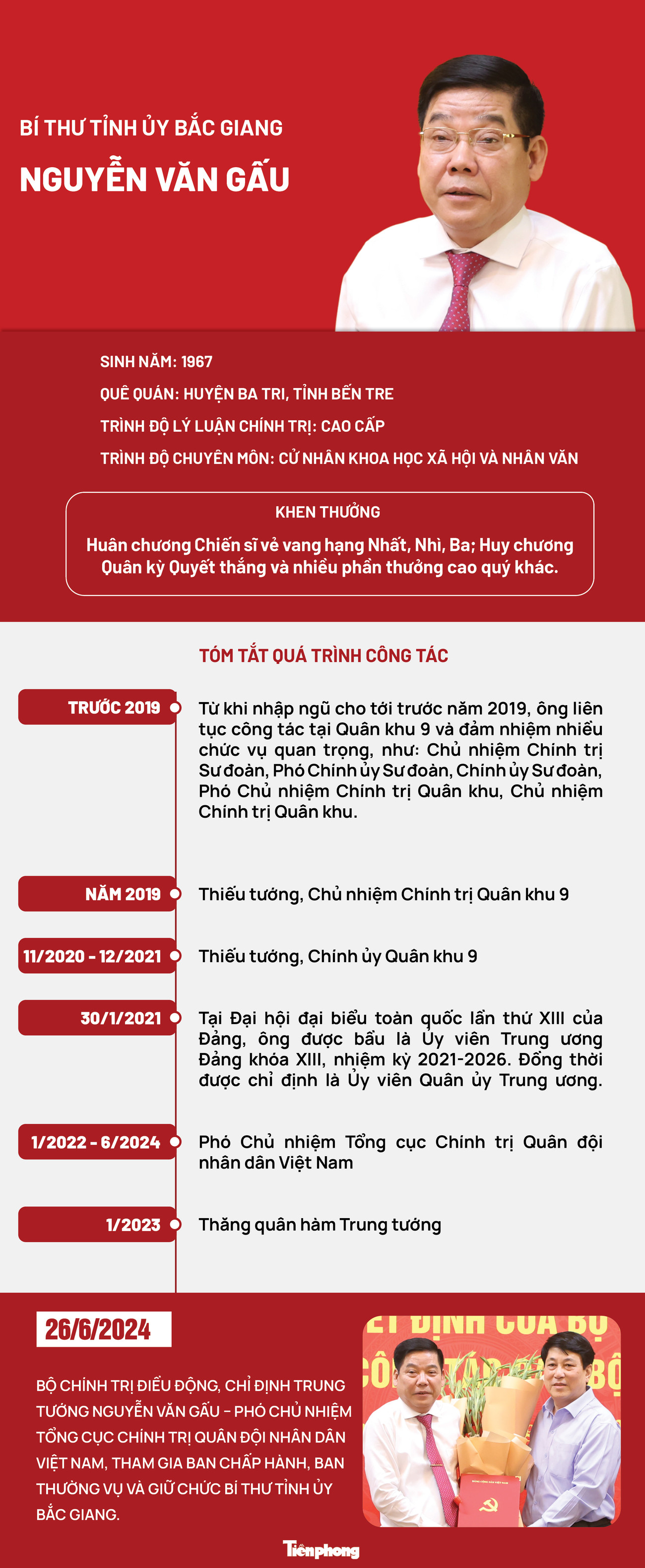 TPO - Bộ Chính trị điều động, chỉ định Trung tướng Nguyễn Văn Gấu – Phó Chủ nhiệm Tổng cục Chính trị Quân đội nhân dân Việt Nam, tham gia Ban Chấp hành, Ban Thường vụ và giữ chức Bí thư Tỉnh ủy Bắc Giang.
