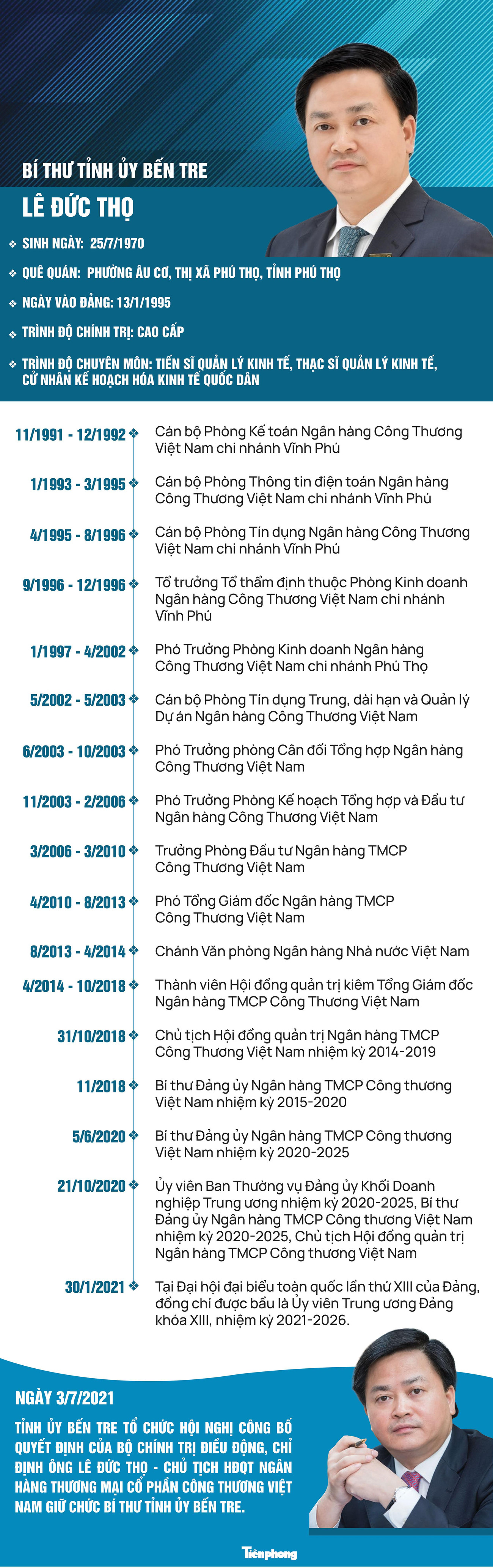 TPO - Ngày 3/7, Tỉnh ủy Bến Tre tổ chức hội nghị công bố quyết định của Bộ Chính trị điều động, chỉ định ông Lê Đức Thọ - chủ tịch HĐQT Ngân hàng Thương mại cổ phần công thương Việt Nam (VietinBank) - giữ chức Bí thư Tỉnh ủy Bến Tre.