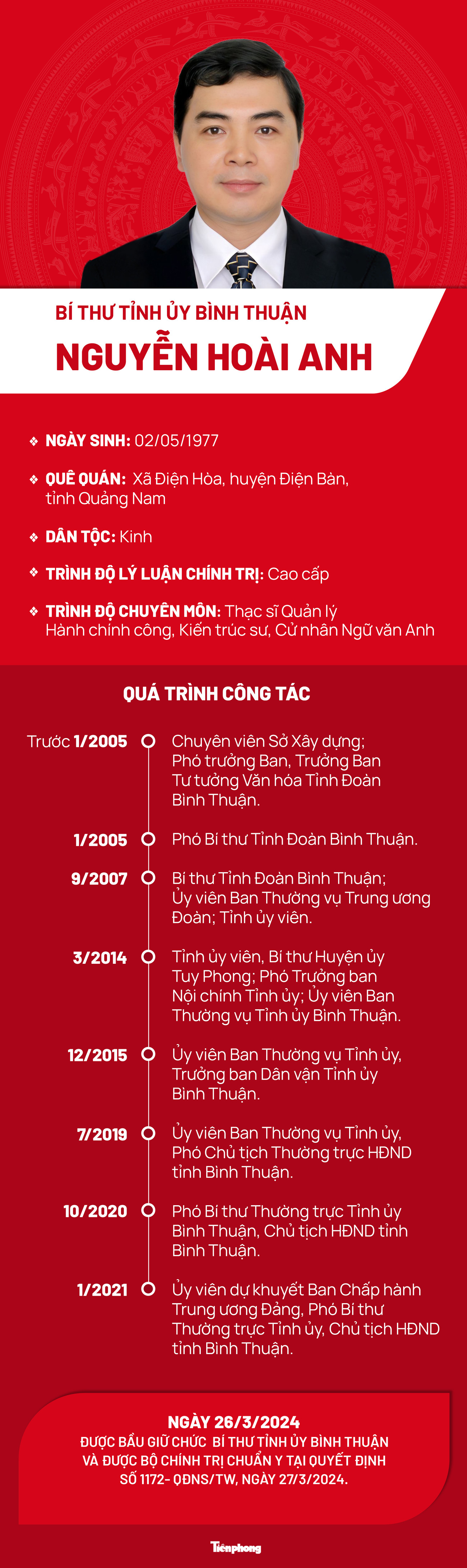 TPO - Ông Nguyễn Hoài Anh - Ủy viên dự khuyết Trung ương Đảng, Phó Bí thư thường trực Tỉnh uỷ, Chủ tịch HĐND tỉnh Bình Thuận - vừa được bầu giữ chức vụ Bí thư Tỉnh ủy Bình Thuận.