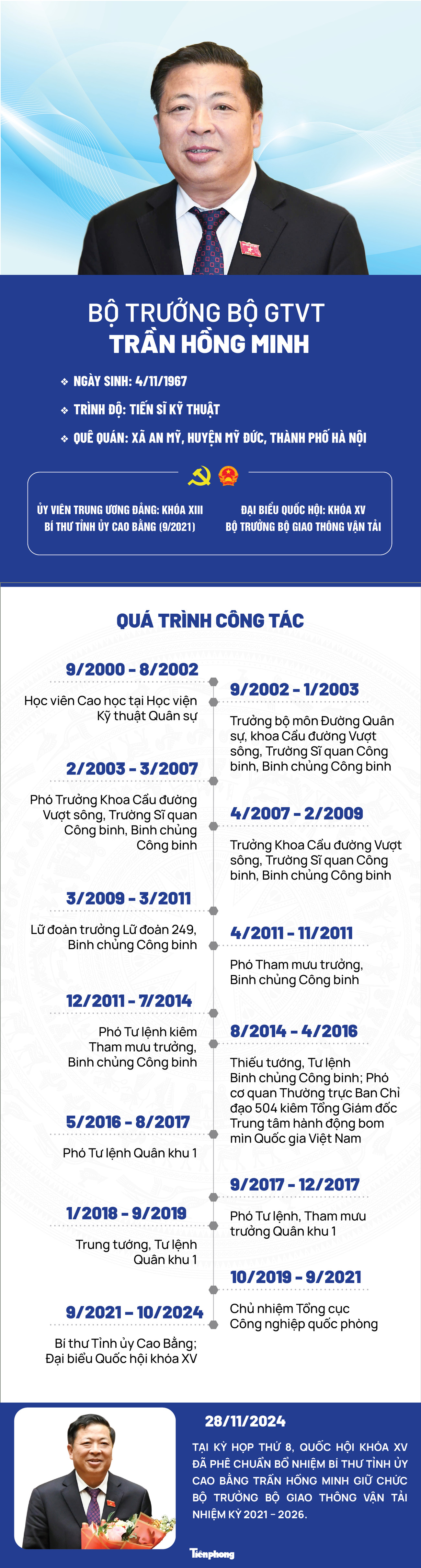 TPO - Ngày 28/11, tại Kỳ họp thứ 8, Quốc hội khóa XV đã phê chuẩn bổ nhiệm Bí thư Tỉnh ủy Cao Bằng Trần Hồng Minh giữ chức Bộ trưởng Bộ Giao thông vận tải nhiệm kỳ 2021 – 2026.