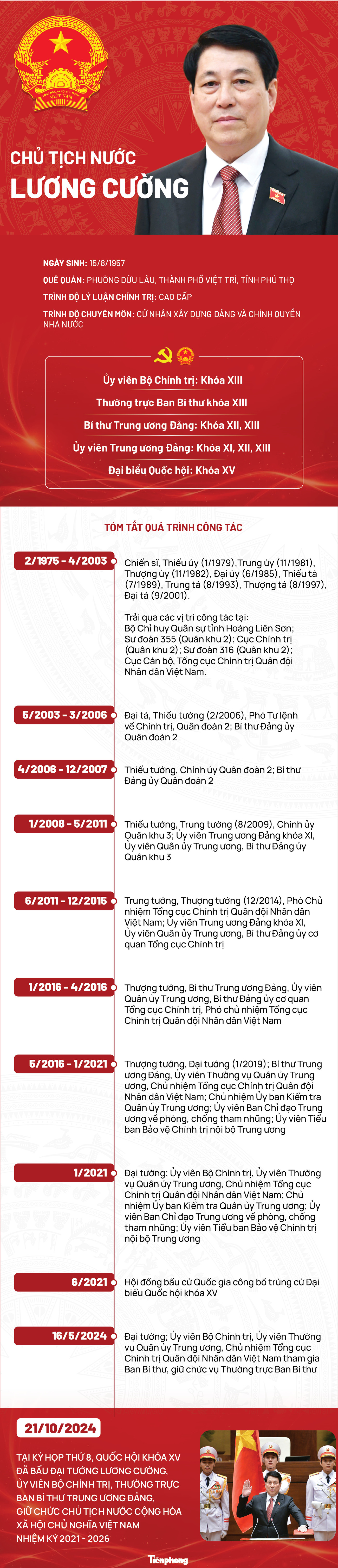 TPO - Ngày 21/10/2024, tại Kỳ họp thứ 8, Quốc hội Khóa XV đã bầu Đại tướng Lương Cường, Ủy viên Bộ Chính trị, Thường trực Ban Bí thư Trung ương Đảng, giữ chức Chủ tịch nước Cộng hòa xã hội chủ nghĩa Việt Nam nhiệm kỳ 2021 - 2026.