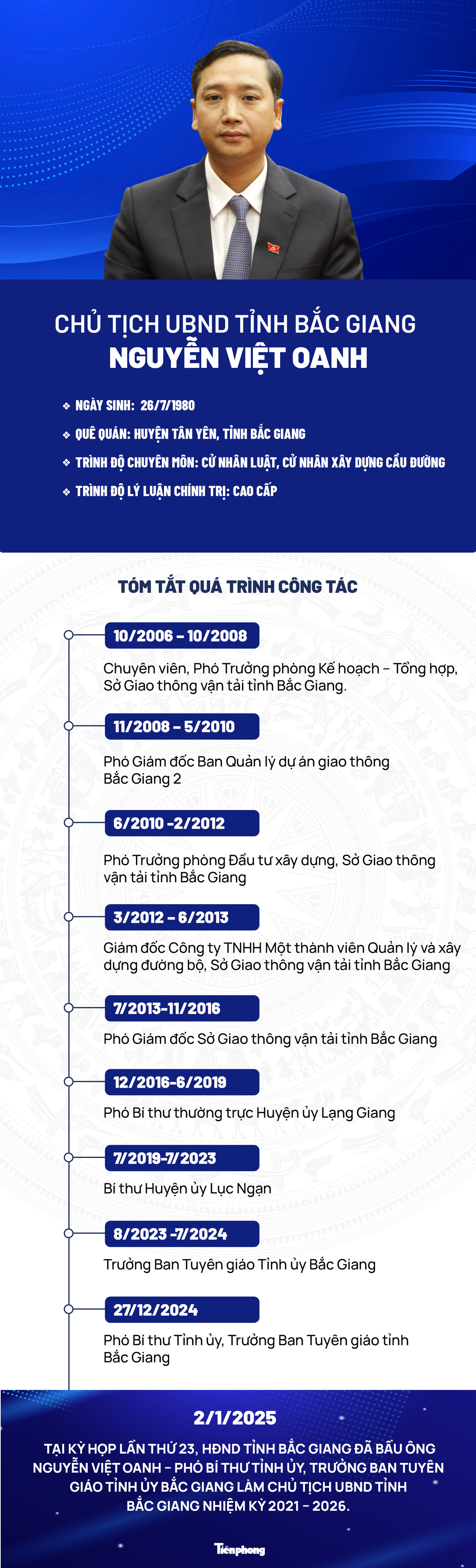 TPO - Tại Kỳ họp lần thứ 23, HĐND tỉnh Bắc Giang đã bầu ông Nguyễn Việt Oanh - Phó Bí thư Tỉnh ủy, Trưởng Ban Tuyên giáo Tỉnh ủy Bắc Giang, làm Chủ tịch UBND tỉnh Bắc Giang, nhiệm kỳ 2021 - 2026.