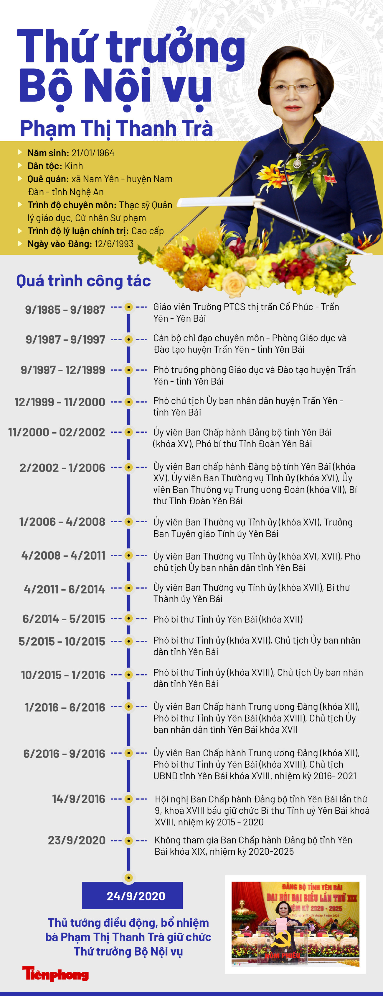 TPO - Ngày 24/9, Thủ tướng Chính phủ có quyết định điều động, bổ nhiệm bà Phạm Thị Thanh Trà, Ủy viên Trung ương Đảng, Bí thư Tỉnh ủy, Chủ tịch HĐND tỉnh Yên Bái, làm Thứ trưởng Bộ Nội vụ. Trước đó, tại Đại hội Đảng bộ tỉnh Yên Bái khóa XIX, nhiệm kỳ 2020-2025, bà Trà không tham gia Ban Chấp hành.