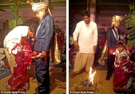Những hình ảnh về lễ cưới tảo hôn dưới đây được ghi lại tại thành phố Chittorgarh, bang Rajasthan, miền bắc Ấn Độ. Những cô bé, cậu bé mới chỉ khoảng 8-10 tuổi từ đây coi như đã “yên bề gia thất”. Có những em bé hoảng sợ không biết chuyện gì đang xảy ra với mình đã khóc lóc, cầu xin cha mẹ, trong khi người thân vẫn bắt ép các em thực hiện các nghi thức, thủ tục.