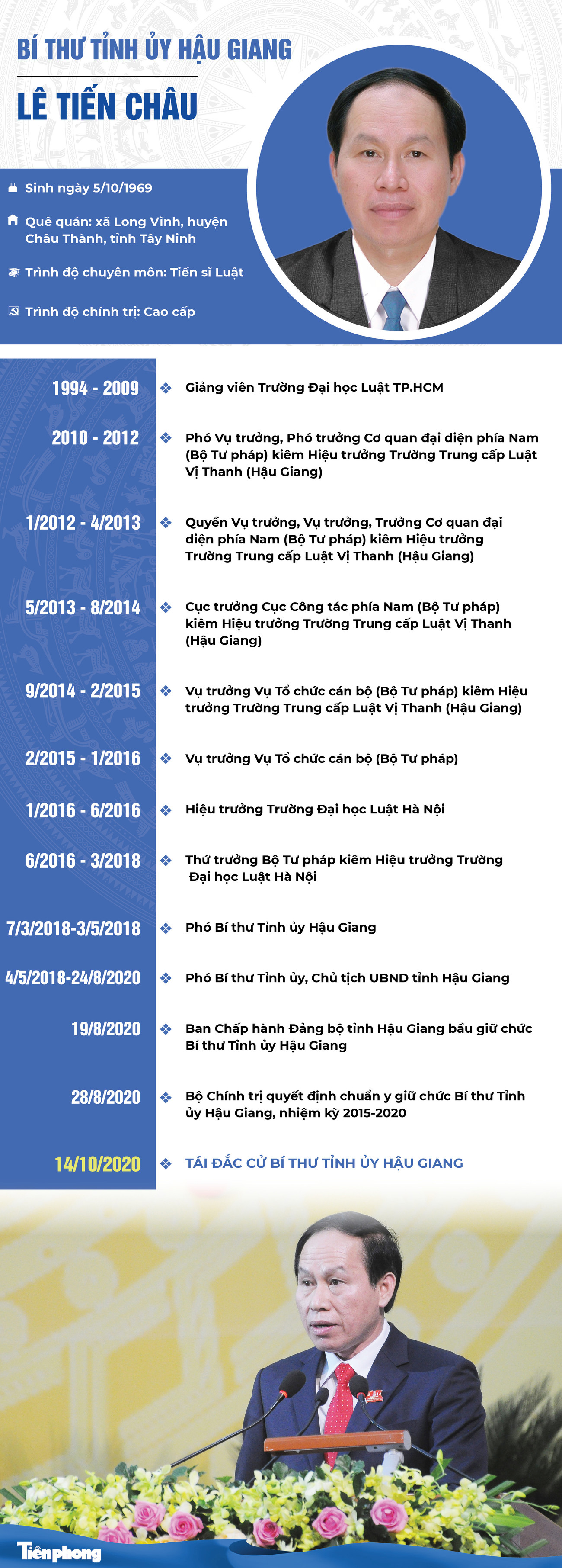 TPO - Ngày 14/10, tại Đại hội Đảng bộ tỉnh Hậu Giang lần thứ XIV nhiệm kỳ 2020-2025, ông Lê Tiến Châu tiếp tục được bầu giữ chức Bí thư Tỉnh ủy.