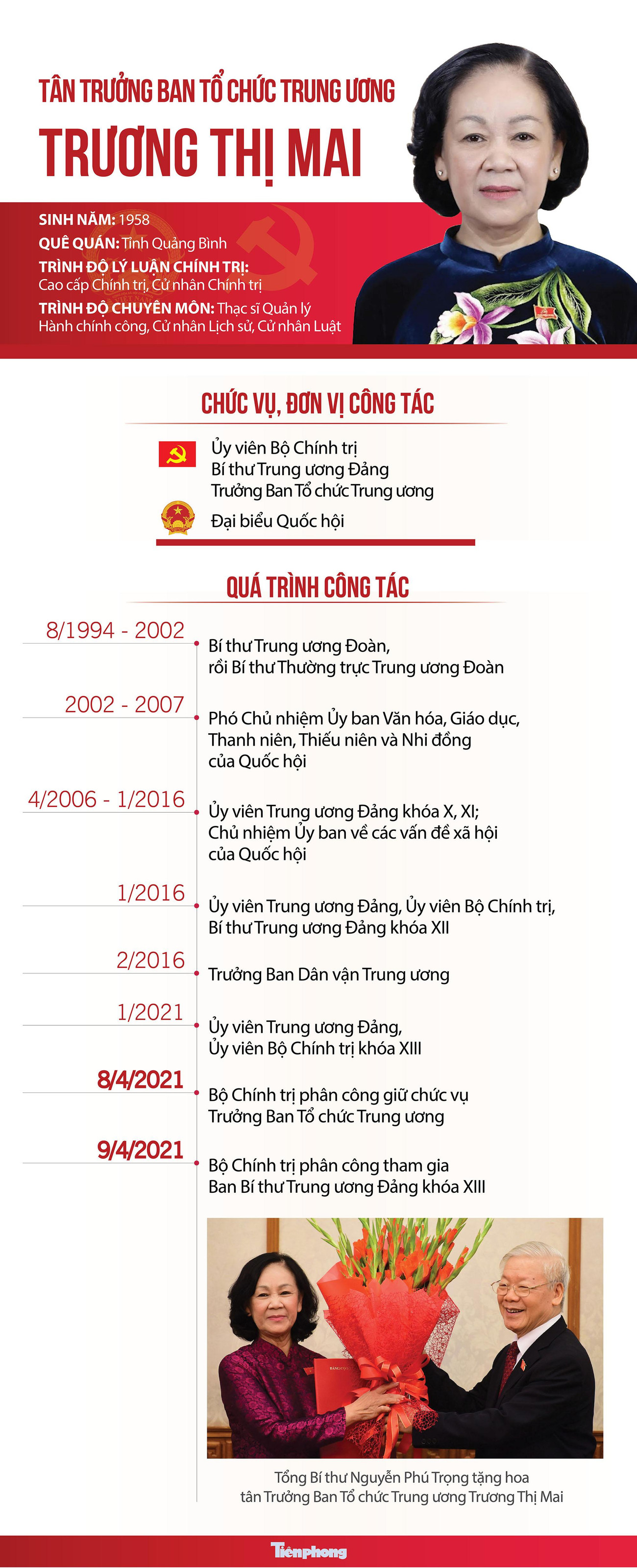 TPO - Bà Trương Thị Mai vừa được Bộ Chính trị phân công giữ chức Trưởng Ban Tổ chức Trung ương. Với việc phân công nhiệm vụ này, bà Trương Thị Mai trở thành nữ Trưởng Ban Tổ chức Trung ương đầu tiên trong lịch sử.