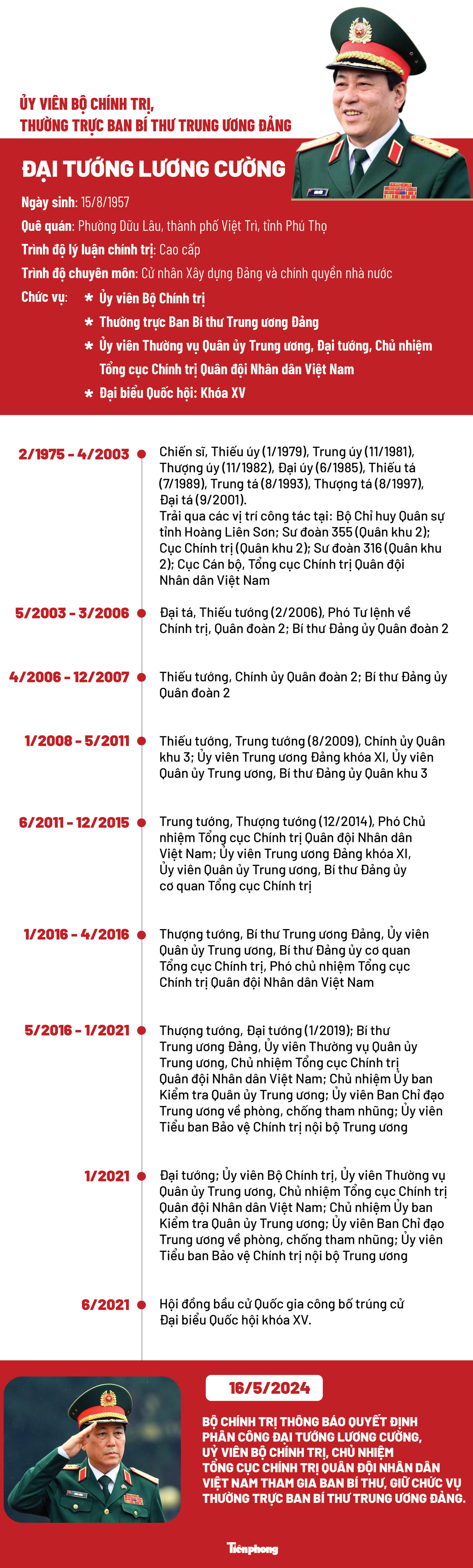 TPO - Đại tướng Lương Cường, Uỷ viên Bộ Chính trị, Chủ nhiệm Tổng cục Chính trị Quân đội nhân dân Việt Nam được Bộ Chính trị phân công tham gia Ban Bí thư và giữ chức vụ Thường trực Ban Bí thư.