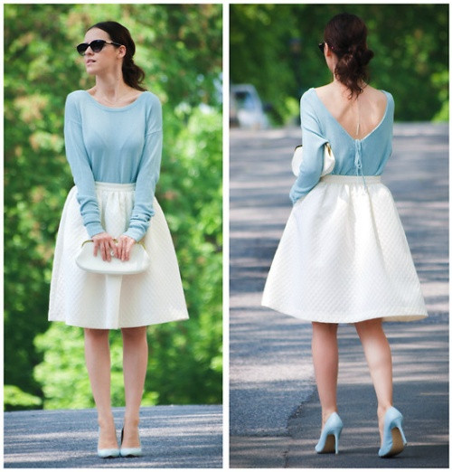 Áo sơ mi trắng và chân váy xòe bồng bềnh dài ngang gối luôn là một bộ đôi ăn ý được nhiều bạn gái yêu thích, đem đến nét ngọt ngào, lãng mạn.