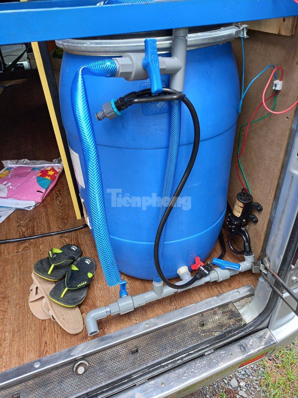 Về vấn đề điện nước trên xe, anh Khải cũng đã tính toán kỹ lưỡng trước khi bắt tay vào làm. Nguồn điện mà anh sử dụng đến từ pin lithium LiFePo4 12V, nạp bằng điện 220V, không sử dụng năng lượng mặt trời hay máy phát. Nguồn nước của xe bao gồm 1 bồn chính dung tích 120 lít kèm theo 2 can phụ 30 lít, tổng khoảng 150 lít. Đây là lượng nước là anh Khải dự tính đủ dùng cho gia đình anh trong 2 ngày 1 đêm.
