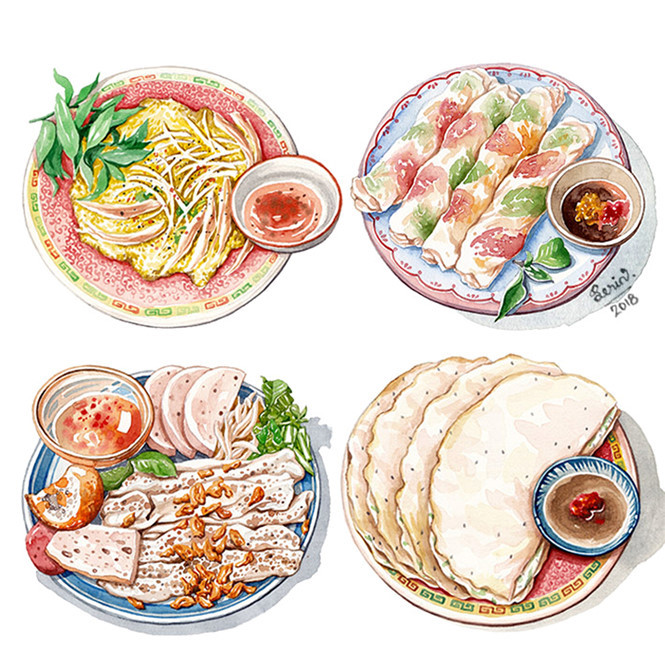 Rin kể: “Lúc đó, mình thực hiện một chuyến đi bụi bằng xe máy từ Sài Gòn ra đảo Lý Sơn (Quảng Ngãi). Hơn 10 ngày, trải qua nhiều vùng đất dọc duyên hải Nam Trung bộ, mình may mắn có cơ hội thưởng thức khá nhiều món ăn ngon của từng địa phương. Điều này rất thú vị và thôi thúc mình nảy ra ý tưởng vẽ lại các món ăn khắp các vùng miền sau chuyến đi này. Từ đó, các bức vẽ cứ thế nối tiếp nhau ra đời. Ban đầu là những món quen thuộc như: canh chua cá hú, cá lóc kho tộ, bánh mì… được vẽ theo cảm hứng là chính”.