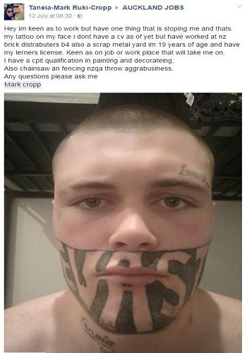 Vài tháng trước, lúc Mark Cropp say rượu khi đang chịu án tù hai năm vì tội trộm cướp trong trại giam ở Christchurch, thành phố lớn nhất Đảo Nam, New Zealand thì bị bạn cùng buồng giam, cũng là anh trai Cropp, xăm lên nửa mặt dưới, theo Independent.