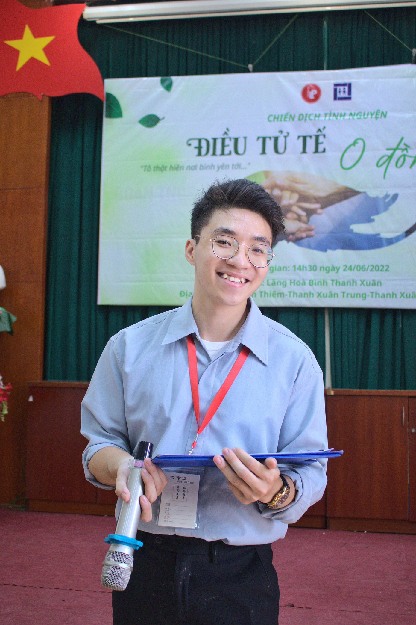 | Quốc Dũng chụp ảnh cùng TS. Nguyễn Xuân Long - Hiệu trưởng Trường Đại học Ngoại ngữ, ĐHQGHN. |