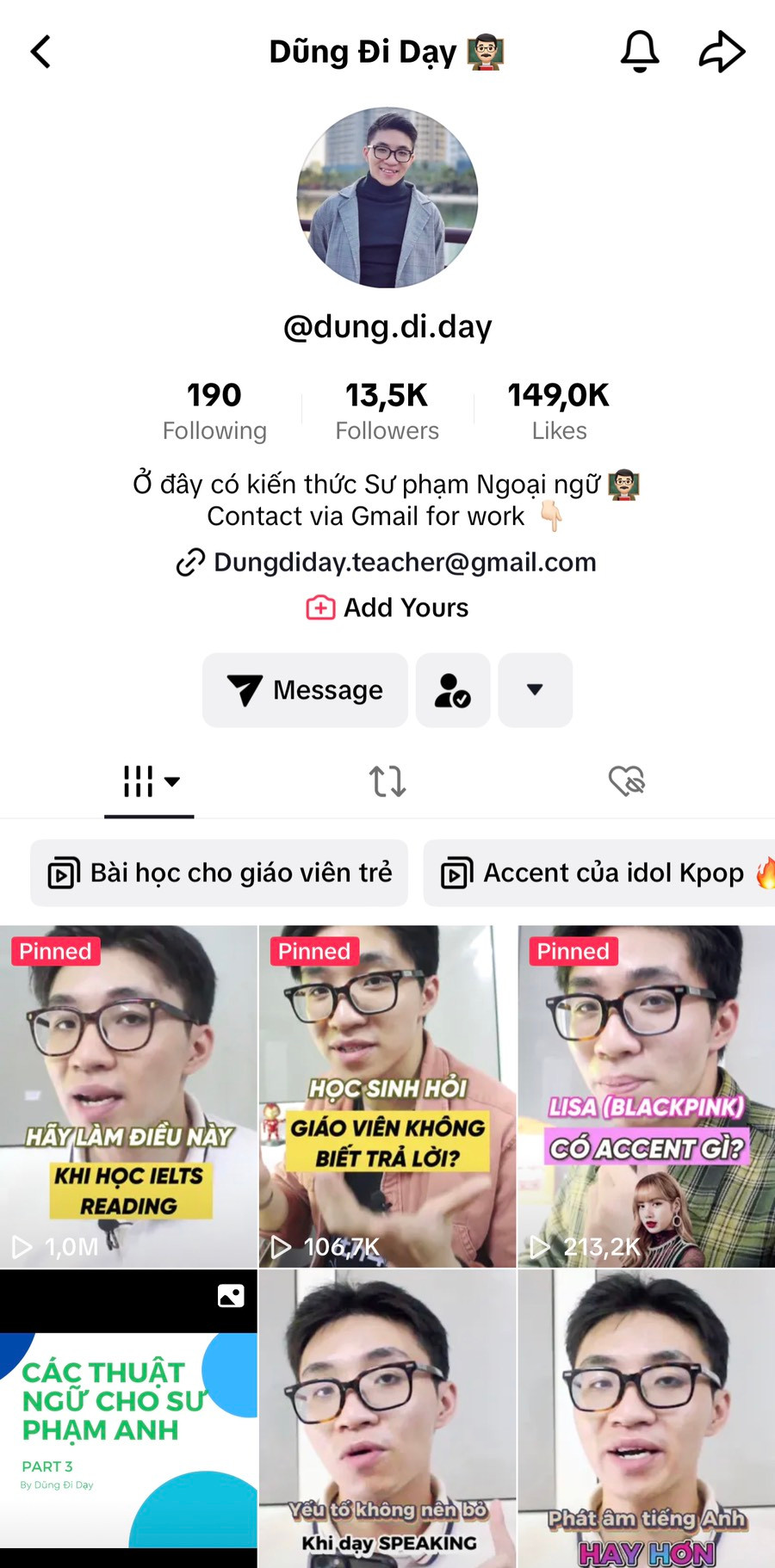 Với Dũng, nghề giáo mang một vẻ hào nhoáng thầm lặng riêng. Đó không chỉ là số điểm học sinh đạt được trên bài kiểm tra mà là người dạy có thể khiến bao nhiêu học sinh yêu quý và được truyền động lực từ mình. Vì vậy, chàng trai đã xây dựng kênh TikTok Dũng Đi Dạy nhằm truyền cảm hứng dạy và học tiếng Anh trong cộng đồng.