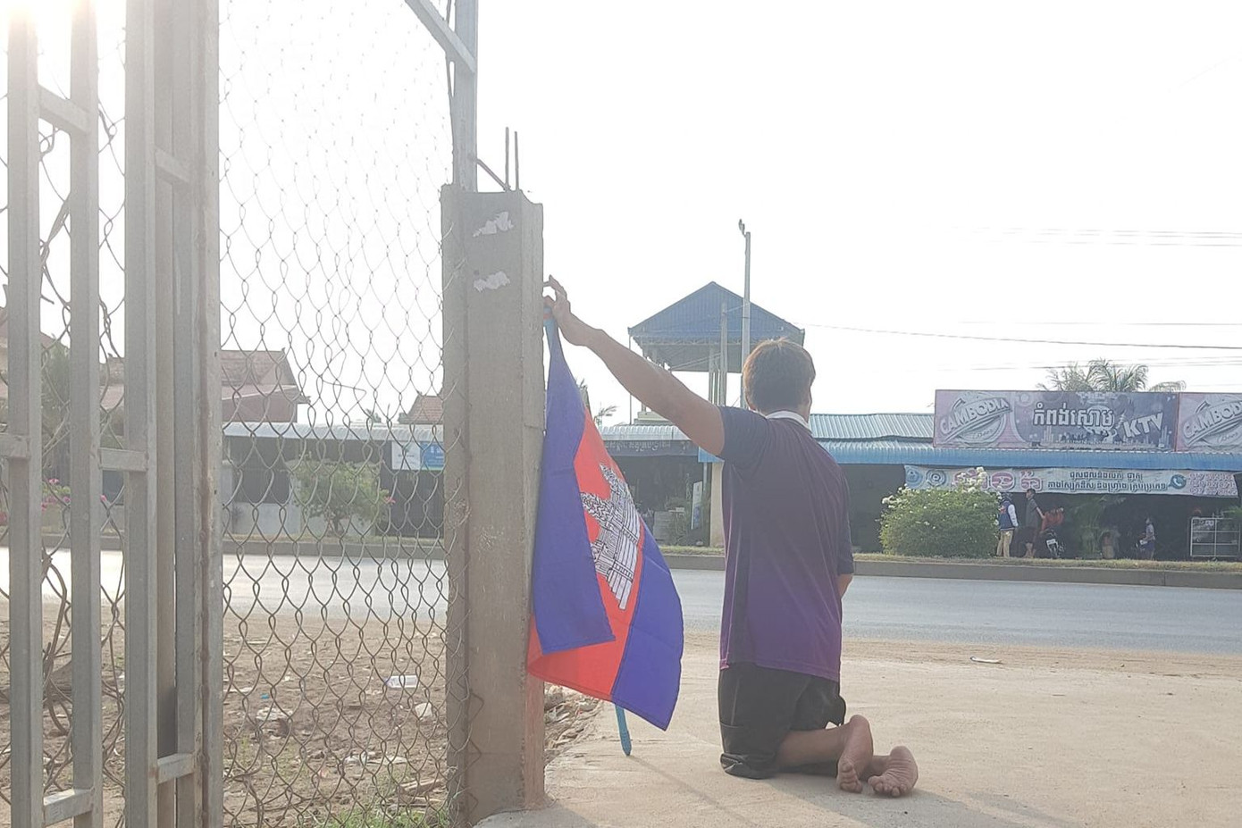 | Chàng trai ở tỉnh Kandal cùng lá cờ Campuchia chờ đoàn rước đuốc SEA Games 32. |