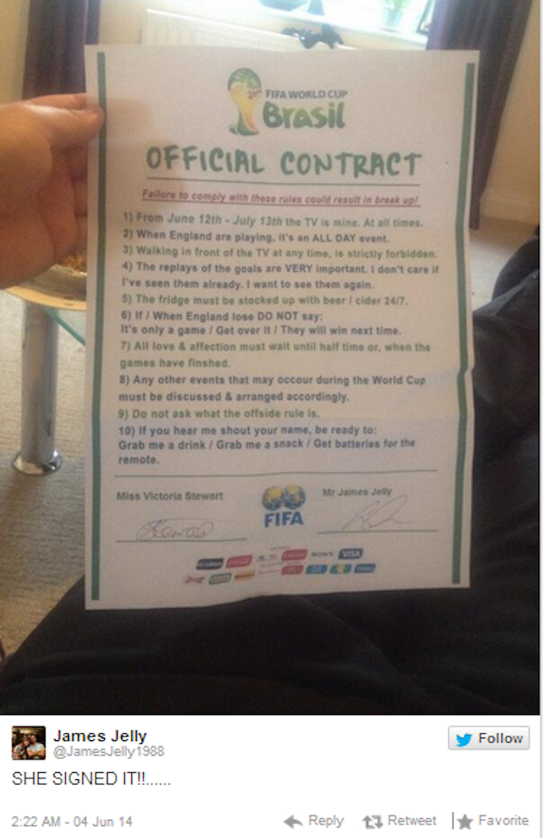Bạn gái của James Jelly, Victoria Stewart, đã đồng ý với những yêu cầu của bạn trai và ký tên vào bản hợp đồng. Tuy vậy, khi Jelly đăng tấm ảnh này lên mạng, anh chàng đã nhận được khá nhiều gạch đá vì thái độ xấc xược với bạn gái. Nhiều người cho rằng Jelly không xem bạn gái của mình ra gì, bởi vì dù thế nào đi nữa, các trận đấu cũng chỉ diễn ra trong một vài giờ đồng hồ, thế nhưng Jelly lại bắt bạn gái nhường TV cho mình cả ngày và còn xem cô như người giúp việc.