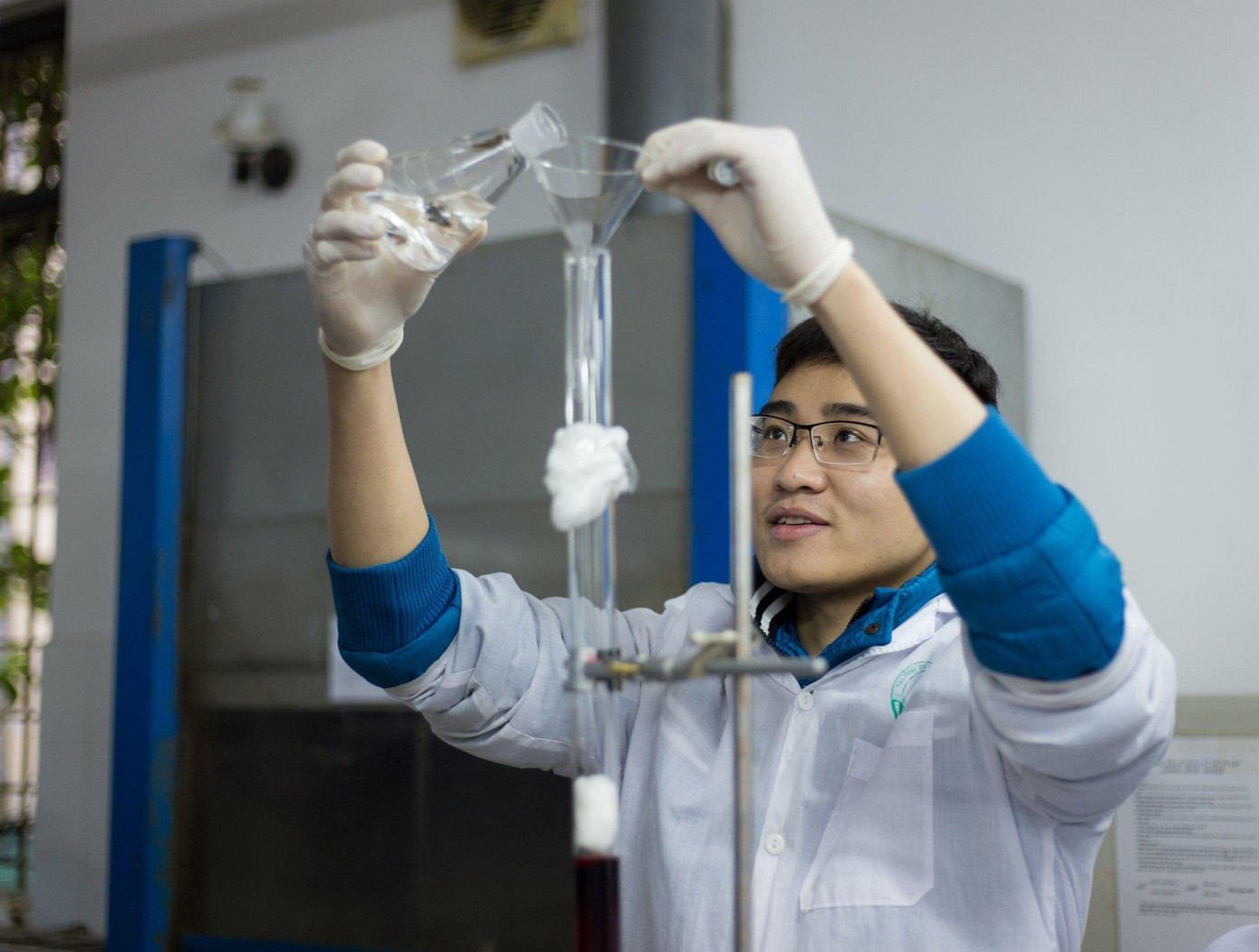 Trở thành nghiên cứu sinh với đề tài “Tổng hợp và đánh giá tác dụng kháng ung thư của một số dẫn chất N-hydroxyheptanamid, N-hydroxypropenamid và N-hydroxybenzamid mới hướng ức chế histon deacetylase”, Tiến Anh ngày đêm miệt mài bên những thiết bị và hóa chất để thực nghiệm.