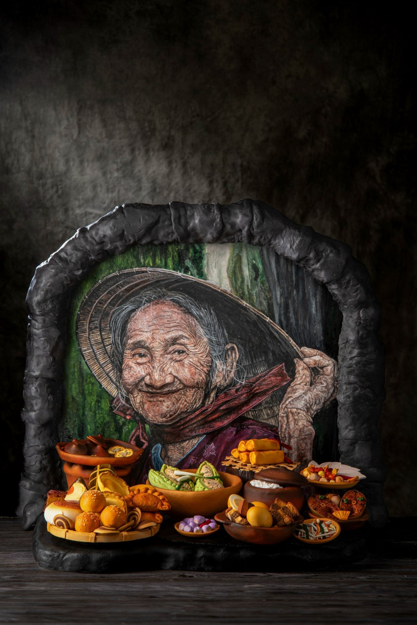 Tác phẩm thứ hai cũng là sản phẩm tâm đắc của Ân mang tên “Memories”, vẽ chân dung một cụ bà trên nền kẹo mềm fondant. Tô điểm thêm cho tác phẩm, Ân còn tạo hình những món ăn quen thuộc như: món dưa giá, thịt kho trứng, canh khổ qua…