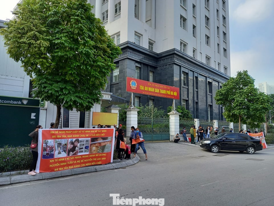 Bên ngoài tòa án, hàng chục người dân đã tập trung, căng băng rôn có nội dung đề nghị pháp luật phải tử hình 2 bị cáo vì những hành vi quá man rợ, mất hết tính người.