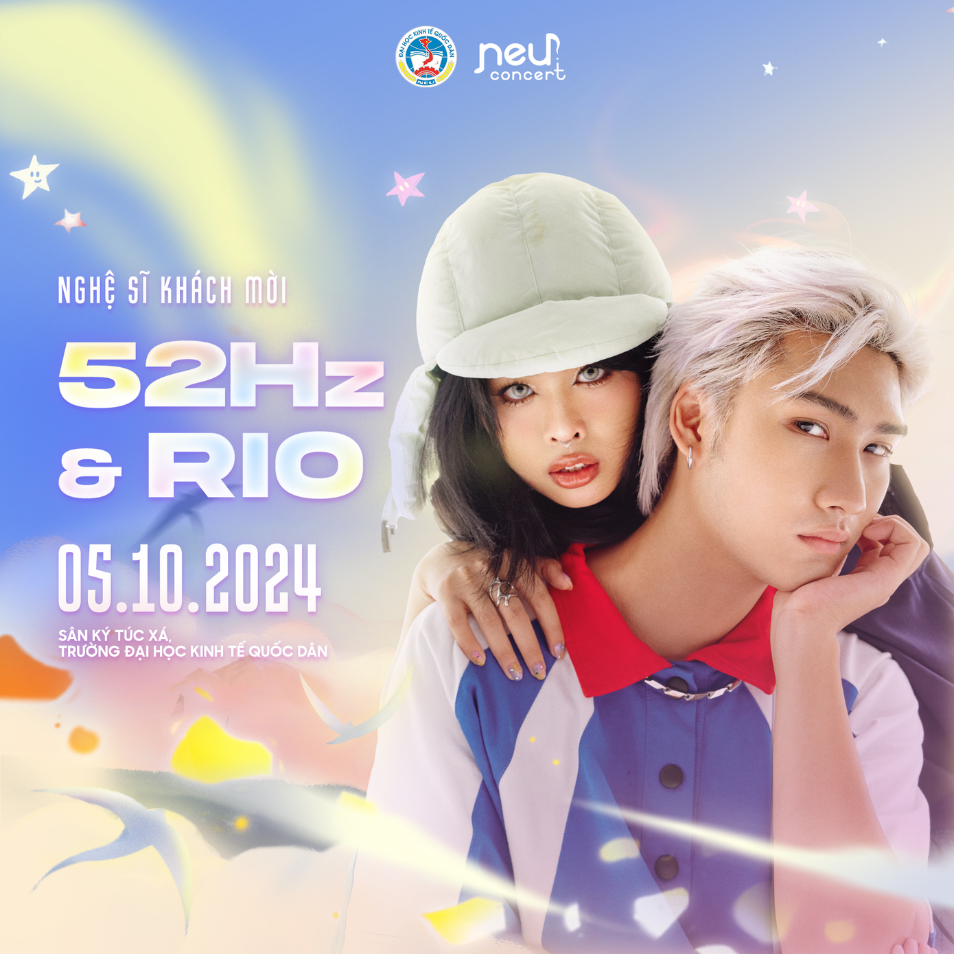 Đến với NEU Concert 2024, các bạn sinh viên sẽ được đắm chìm trong “Mê cung tình yêu” của cặp đôi gà bông 52Hz và Rio. Giữa những bộn bề của cuộc sống, sự kết hợp hoàn hảo giữa 2 giọng ca trẻ sẽ là liều thuốc chữa lành giúp các NEUers thư giãn và nạp thêm những năng lượng tích cực hơn.