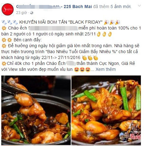 Anh Cường, chủ quán cháo ếch trên, cho hay, “mới chạy chương trình được 3 ngày mà lượng khách tới quán đông hơn hẳn, nhiều khách đến ăn được giảm giá lên đến 60-70%. Đặc biệt, vào ngày 25/11, rất nhiều khách có ngày sinh trùng với ngày Black Friday gọi điện đặt bàn trước để được ưu đãi”, anh Cường nói.